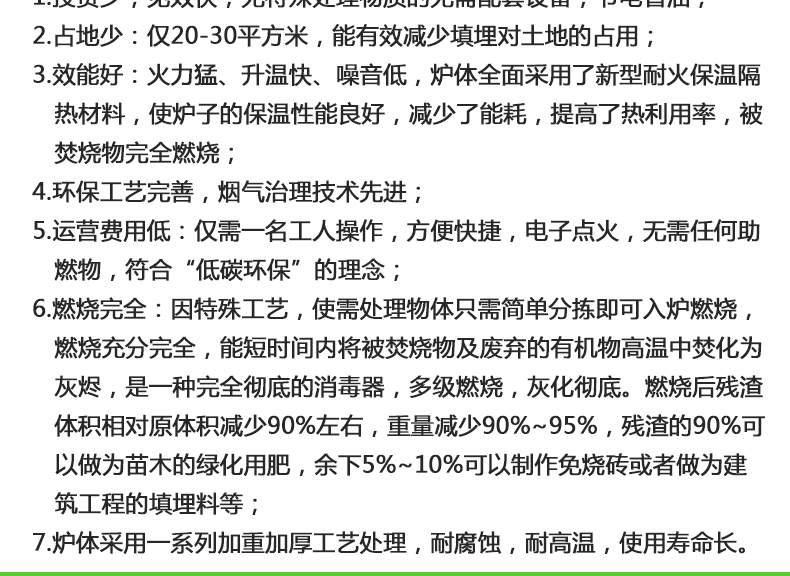 3、化焚燒、混合焚燒、燃盡處理等技術,使排煙、煙塵含量、二惡英含量等低于國家規定排放標準