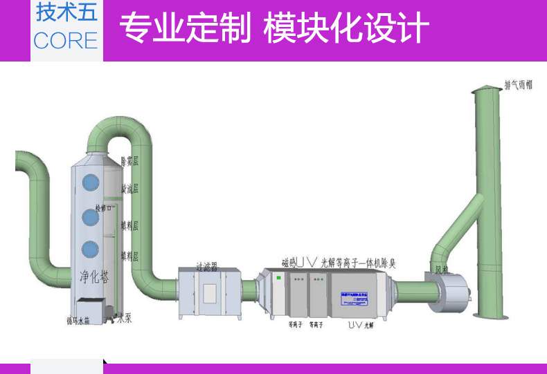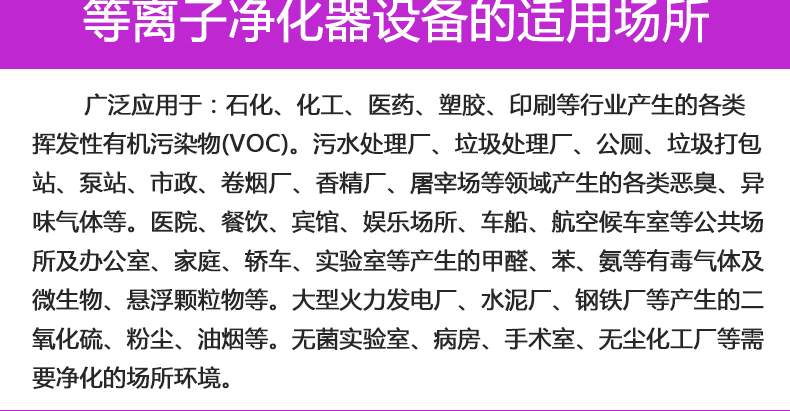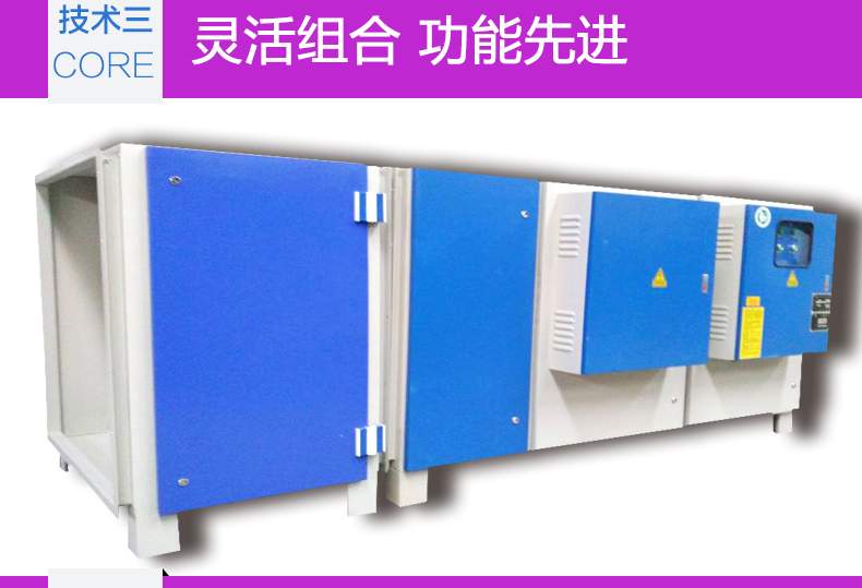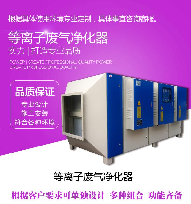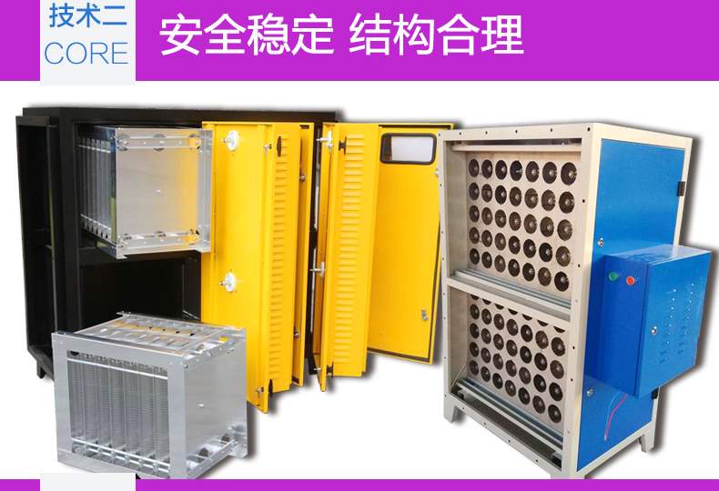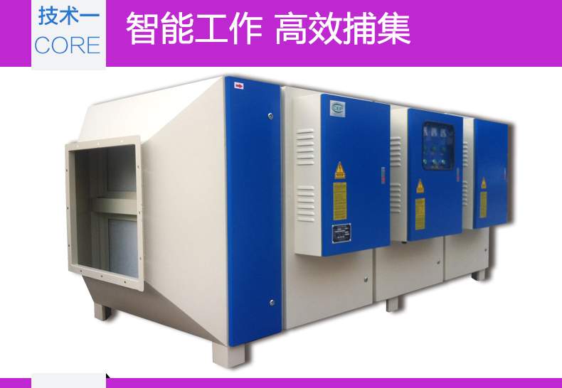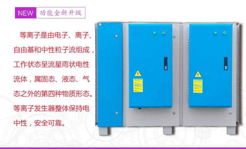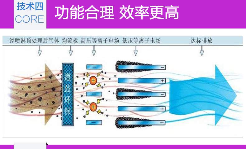 等離子體與固體、液體、氣體一樣,是物質的一種聚集狀態,是繼固、液、氣三態后被列為物質的“第四態”。由正離子、負離子、電子和中性粒子組成。在這個體系中因其總的正、負電荷數相等,故稱為等離子體。氣體(惰性氣體除外)在一定電壓和頻率電場作用下均可被電離或擊穿,產生包括電子、各種離子、原子和自由基在內的等離子體。 常規意義上的等離子體態是中性氣體中產生了相當數量的電離,當氣體溫度升高到其粒子的熱運動動能與氣體的電離能可以比擬時,粒子之間通過碰撞就可以產生大量的電離過程。等離子技術產生的高能電子能量高,自由基密度大,因此絕大部分有毒有害物質均能被分解,且處理對象廣泛,對各種工業有機廢氣及國家《惡臭污染排放標準》中規定的八大惡臭物質均能有效去除。 當外加電壓達到氣體的放電電壓時,氣體被擊穿,產生大量電子、離子、原子和自由基在內的混合粒子。這些高能活性粒子和廢氣中的污染物作用,使廢氣分子在極短的時間內發生分解,以達到凈化廢氣的目的。電場的設計使廢氣分子的運動速度較低,零點幾秒內便能使其負載足夠的電荷。帶電粒子在電場中會受到電場力(庫侖力)的作用,使廢氣分子被吸附至陽極,因此凈化率非常高。粒子電離后產生的電子平均能量約為1eV~10eV,因此控制反應條件可以使反應變得十分快速。